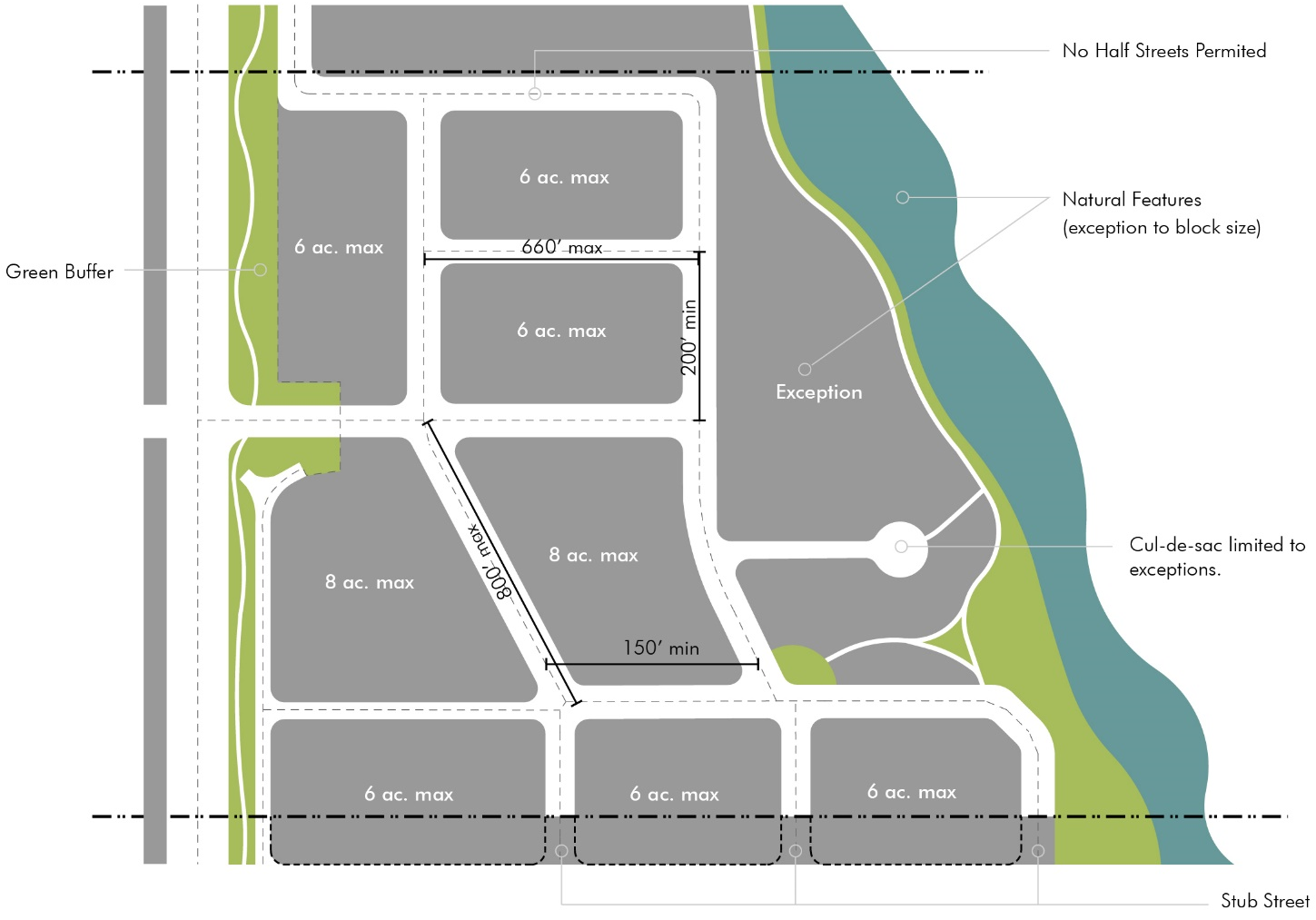 Street networks shall establish typical block sizes in Table 3-1, and irregular block
