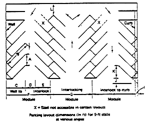 If the parking space is at an angle to the street, clearance behind the space shall be provided equivalent to the minimum aisle width in Table 1 (for standard-size spaces) or Table 2 (or compact spaces).