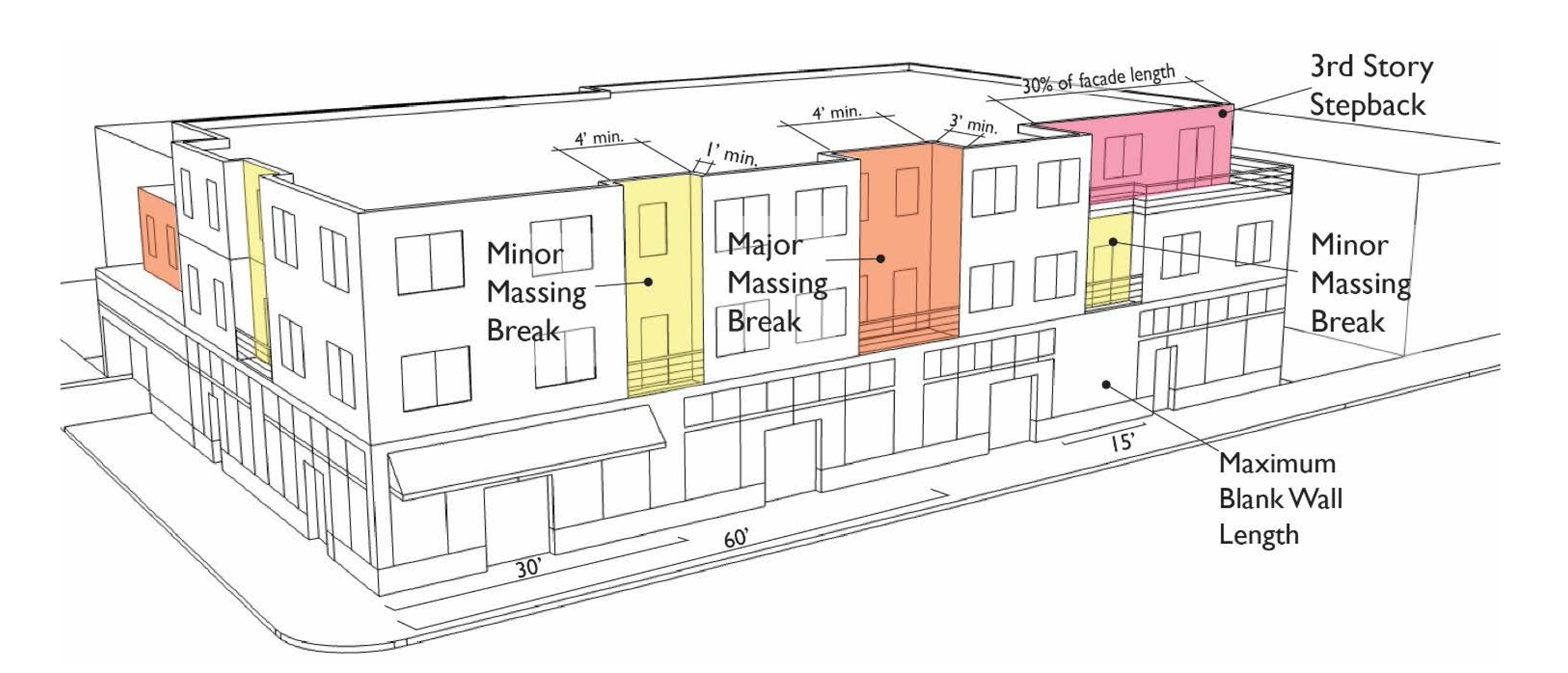 Massing Breaks. Massing breaks, as described below, shall be required for buildings with street frontage of thirty (30) feet or greater. Ground floor non-residential uses shall be exempt from massing break requirements.