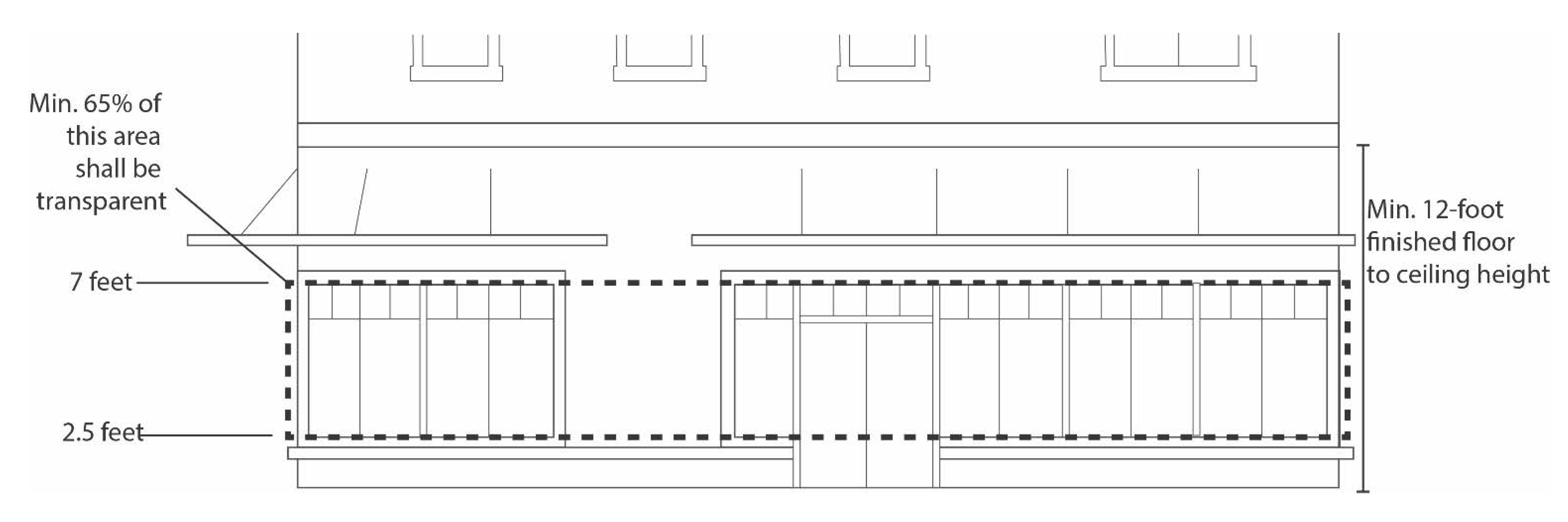 Ground Floor Transparency. The ground-floor street-facing building walls of non-residential uses shall provide transparent windows or doors with views into the building for a minimum of sixty-five percent (65%) of the building frontage located between two and one-half (2½) and seven (7) feet above the sidewalk. Ninety percent (90%) of the transparent windows or doors area shall remain clear to allow views into the building. The transparent area shall be maintained and not obscured. Street-facing areas used as parking structures or garage doors are exempt from this requirement, but are subject to the design requirements in subsection H.3 below.