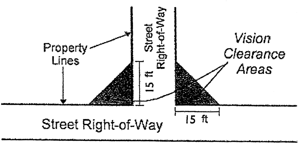 Street vision clearance at corners. Except in the D zone, W zone, and LB zone, no building or structure shall be erected and no vegetation shall be maintained between a height of three feet and ten feet above the street level of the triangle formed by the two street lines and a third line joining points on the street lines 15 feet from the intersection. A street line is defined as the line separating the property from the street right-of-way.