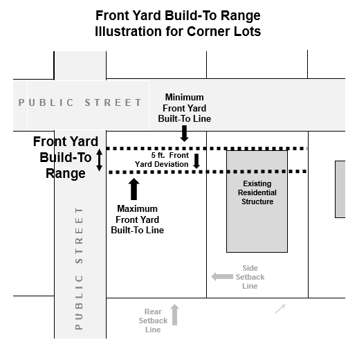 For corner lots the residential front façade shall be located no closer to the public right-of-way than the adjacent structure closest to the public right-of-way and shall be no farther from the public right-of-way than five (5) feet past the front façade of the same structure. For further information see the illustration below.