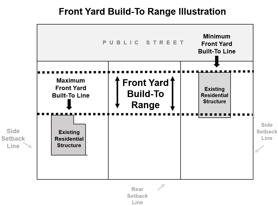The residential front façade shall be located no closer to the public right-of-way than the adjacent structure closest to the public right-of-way and shall be no farther from the public right-of-way than front façade of the adjacent structure that is farthest from the public right-of-way. For further information see illustration below.