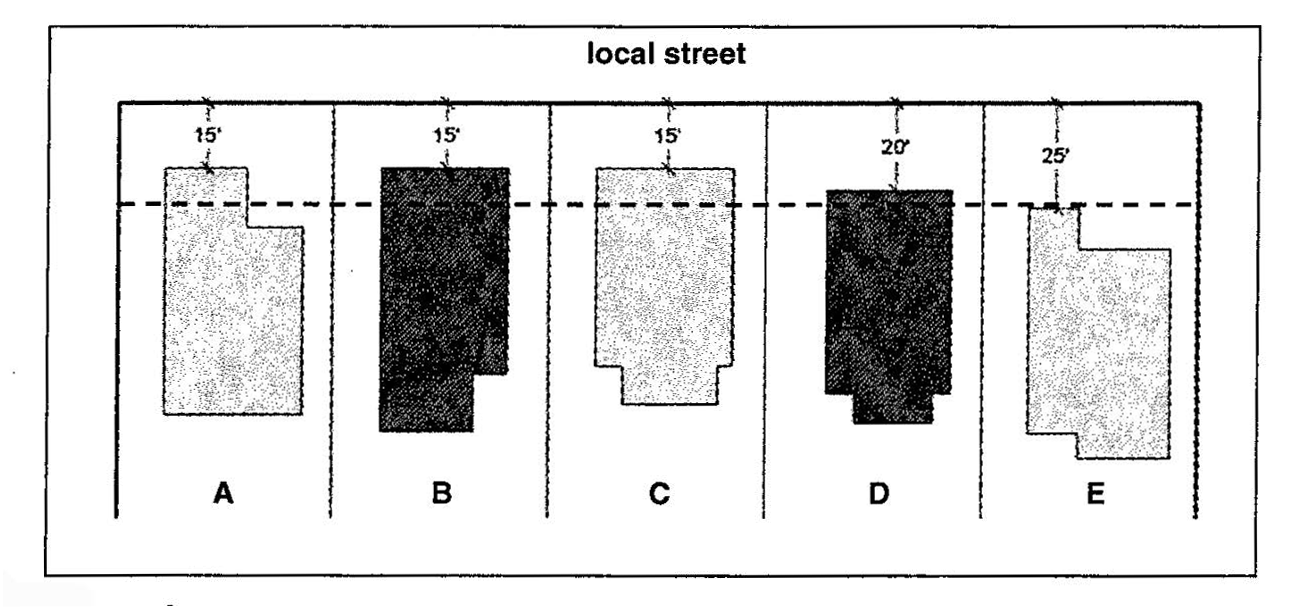 Illustration 4.1: Contextual Front Setbacks. (The required front district setback in the illustration is 25 feet, shown by the dotted line. There are existing houses on sites A, C, and E. A house built on site B may have a front setback of just 15 feet, which is the average of the front setbacks of the two abutting lots. A house built on site D may have a front setback of 20 feet, which is half-way between the front setback on the abutting lot that is lower than the district requirement (lot C) and the required front setback.)