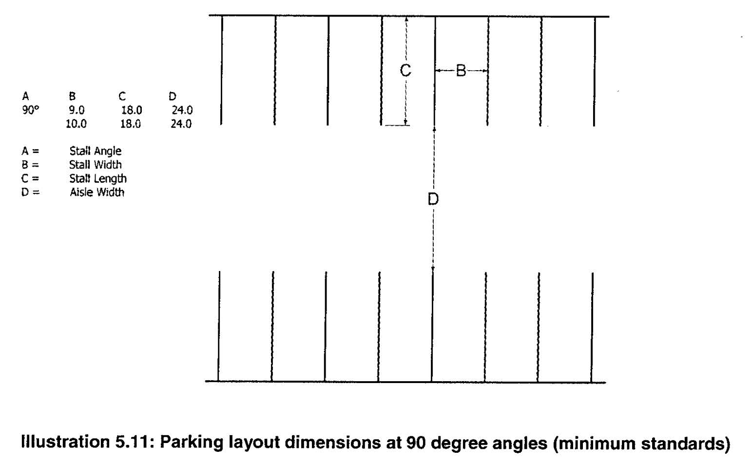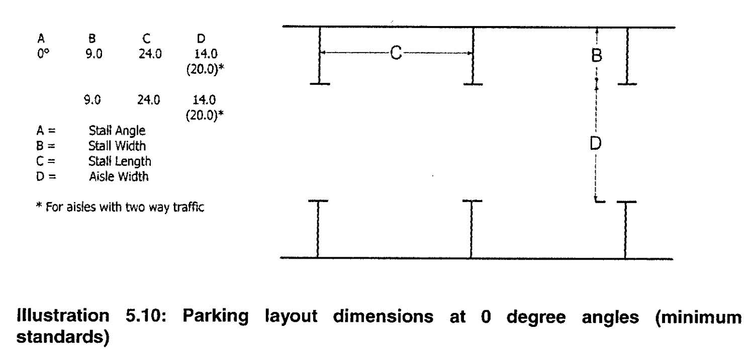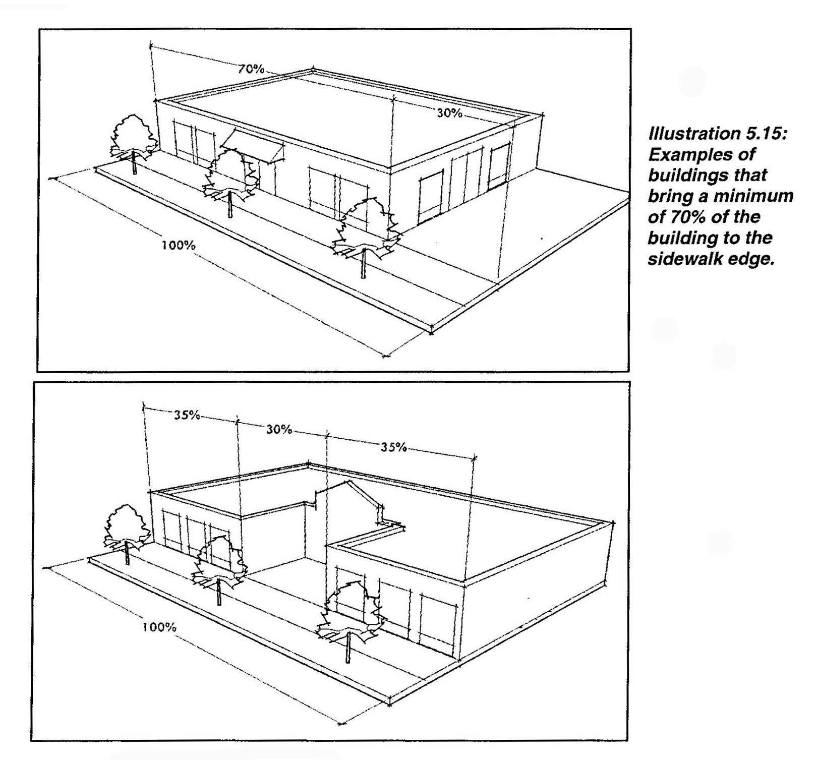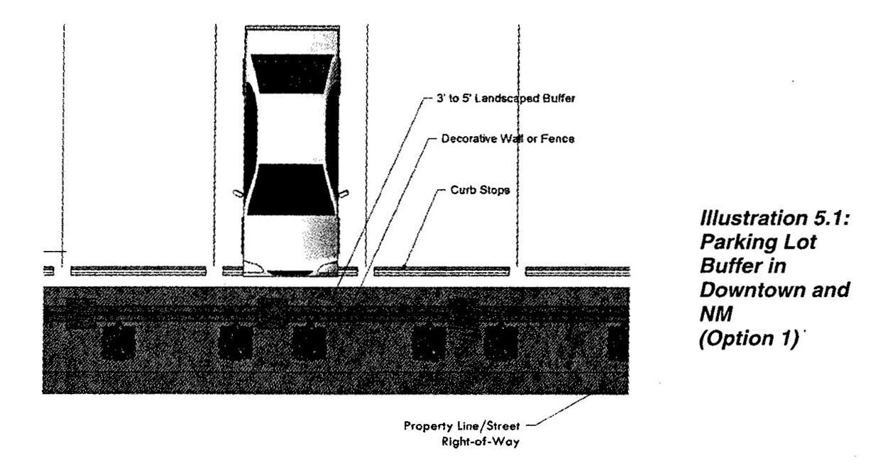 Option 1: A perimeter landscaped strip of between three feet and five feet in width, built to the street right-of-way, with either ornamental fencing or masonry walls, and wheel stops or curbing in the parking lot to prevent any vehicle overhang into the landscaped area (See Illustration 5.1 below); or