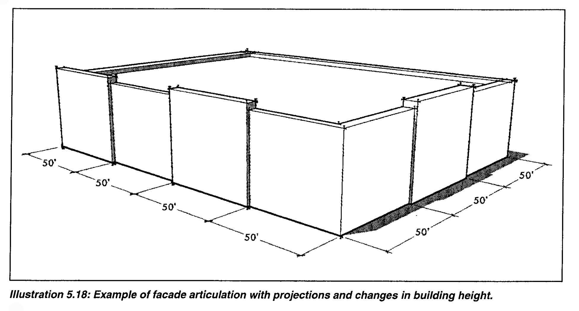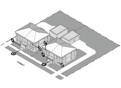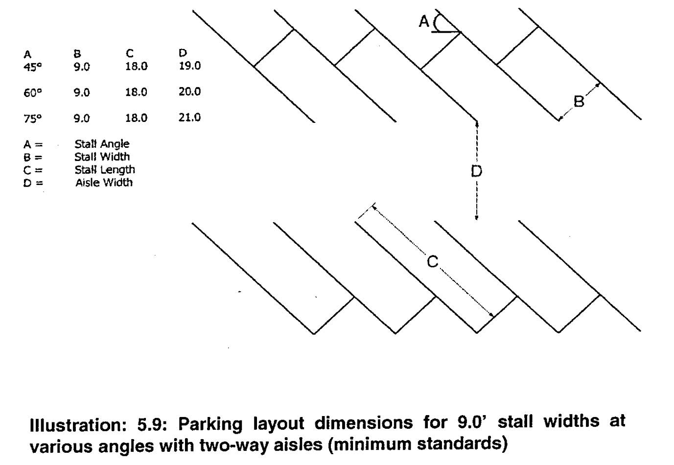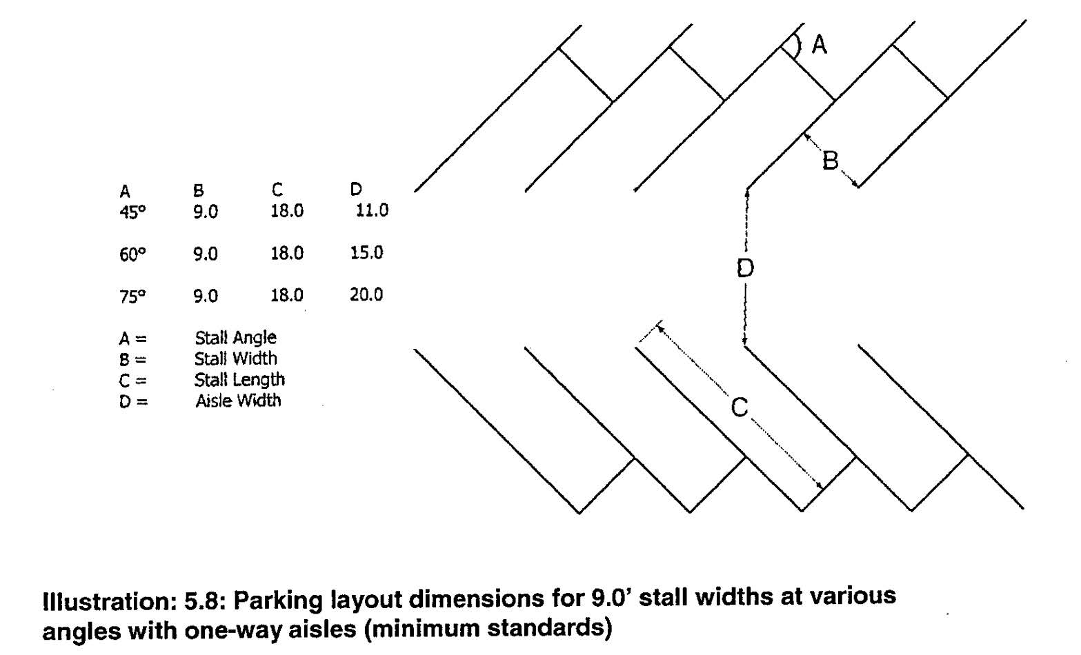 Option 1: A perimeter landscaped strip of between three feet and five feet in width, built to the street right-of-way, with either ornamental fencing or masonry walls, and wheel stops or curbing in the parking lot to prevent any vehicle overhang into the landscaped area (See Illustration 5.1 below); or