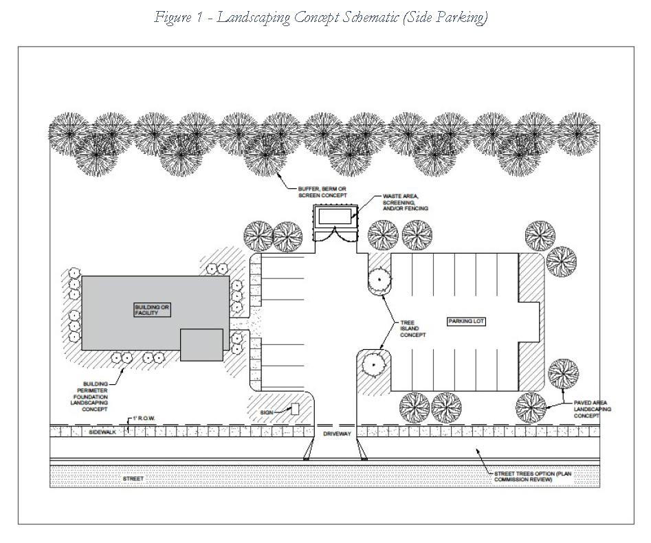 Paved areas. Landscaping shall be planted in and or around each paved or other hard-surfaced area including gravel parking lots where approved by the plan commission. Paved area landscaping concepts are encouraged to include the following (see figures for schematic examples):