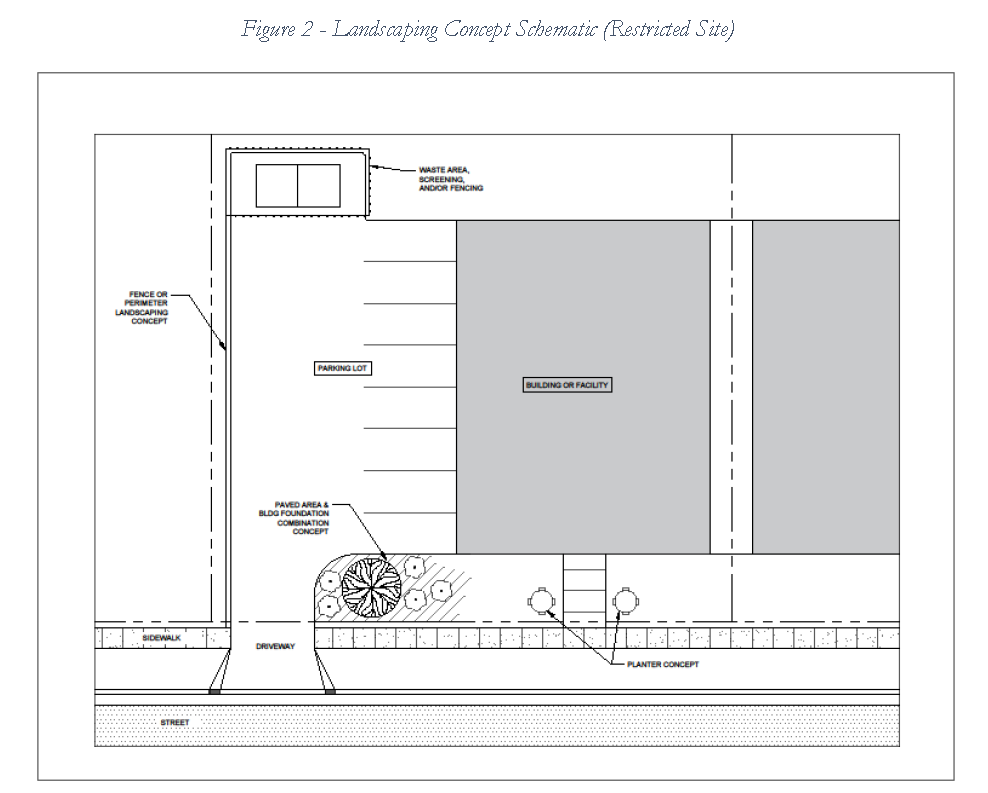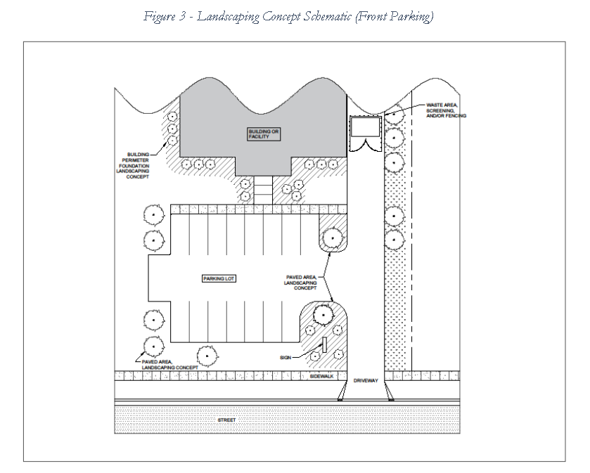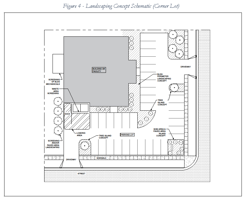 Combinations of the above concepts, together with building perimeter landscaping, waste area screening or other building/site elements, are encouraged for comprehensive site design and to lessen the overuse of any one particular landscaping element.