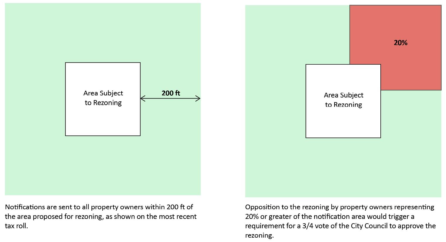 Written notice of all public hearings before the Planning and Zoning Commission on a proposed Zoning Map Amendment (Rezoning) shall be sent to all owners of real property within the zoning amendment area and within two hundred (200) feet of the zoning amendment area or property on which the change is requested.