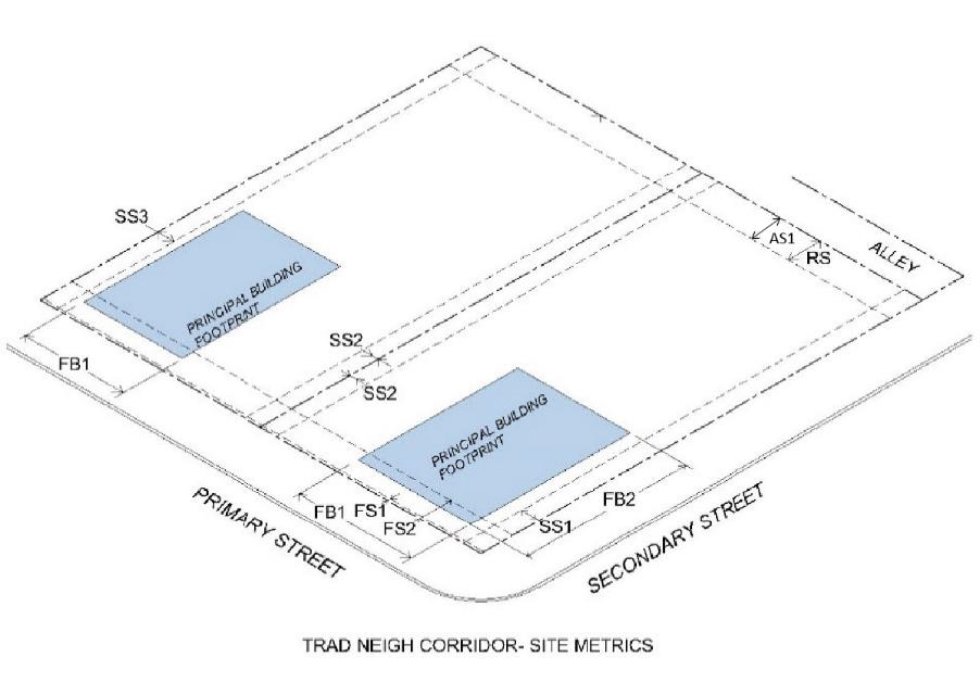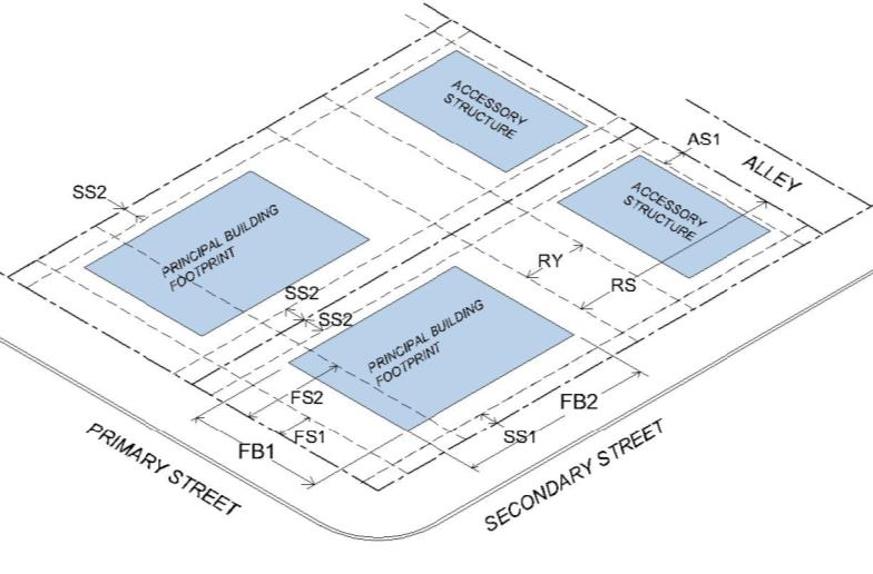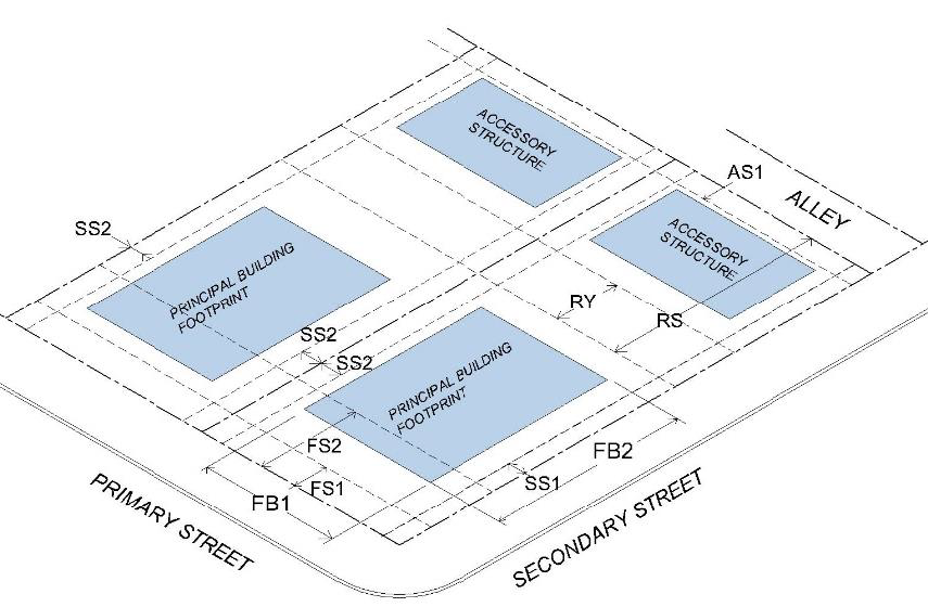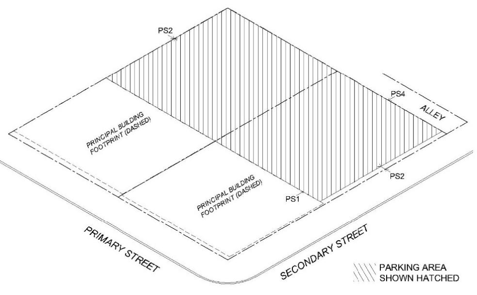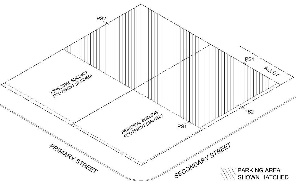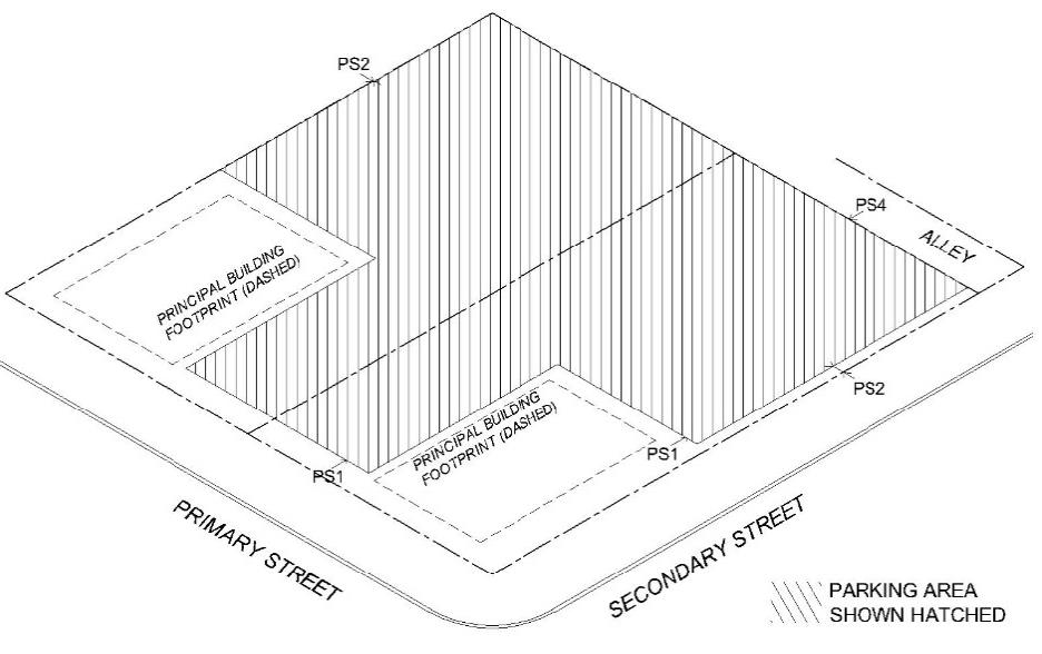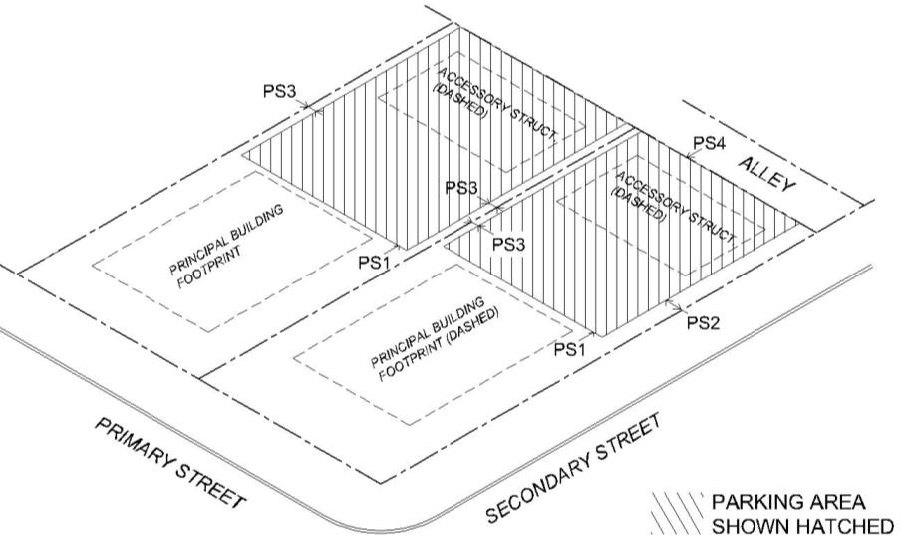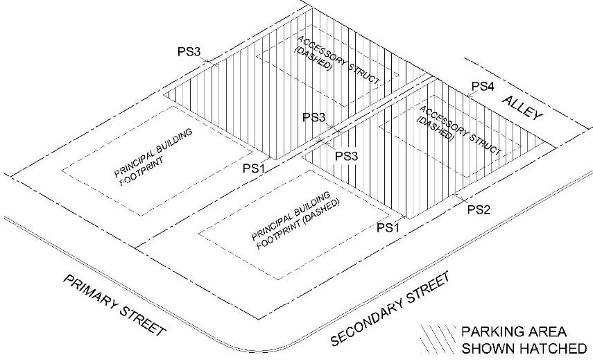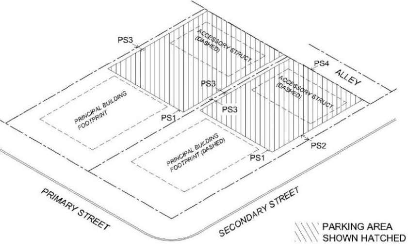 | PARKING PLACEMENT | Off-street parking spaces shall NOT be located in the front setback area along any street frontage |