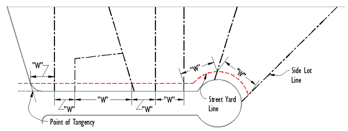 Except for cul-de-sacs, lot width (where they intersect with street line) may not be less than 80% of the minimum required width for the district. In the case of lots on the turning circle of cul-de-sacs, lot widths may be 50% of district requirements.