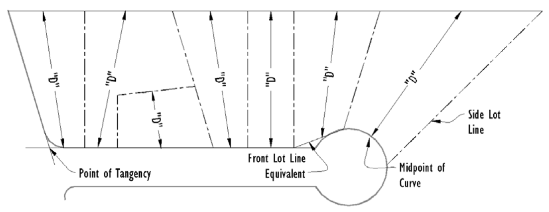 Depth of a lot shall be considered to be the distance between the midpoints of straight lines connecting the foremost points of the side lot lines in the front and the rear. On corner lots, the street side lot line is considered to extend to the point of tangency with the front lot line. On lots located on the interior of a cul-de-sac, the front most measurement point is assumed to be the midpoint of the curve between the side lot lines.