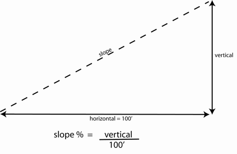 Slope. The vertical rise in feet measured over a horizontal distance of 100 feet, expressed as a percentage, measured generally at right angles to natural contour lines, and extending across property lines if necessary to obtain the 100-foot measurement, but not extending across significant changes in grade. See illustration.