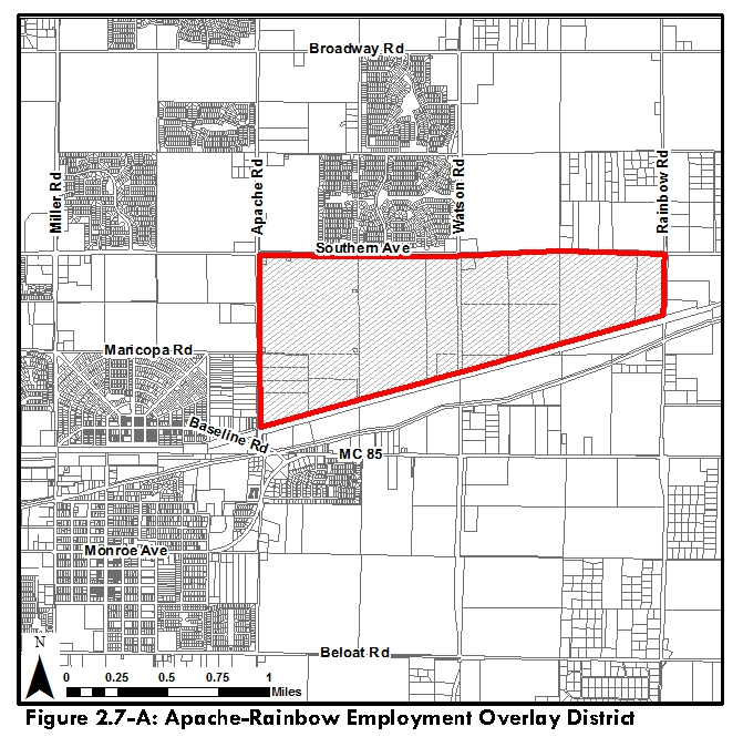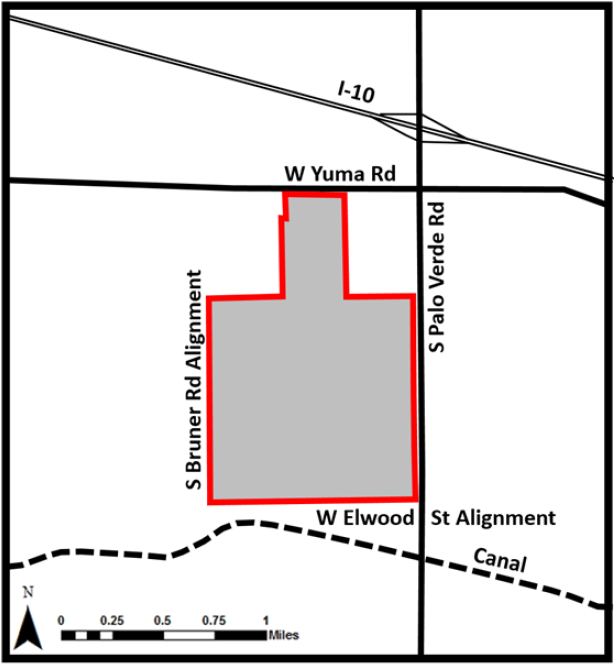 Boundaries. The boundaries of the Buckeye Airport Overlay District are established as shown on Figure 2.7-B generally bounded by West Yuma Road to the north, South Palo Verde Road to the east, West Elwood Street alignment to the south, and South Bruner Road alignment to the west. Boundaries are subject to change as the airport acquires additional real property for airport expansion and development.
