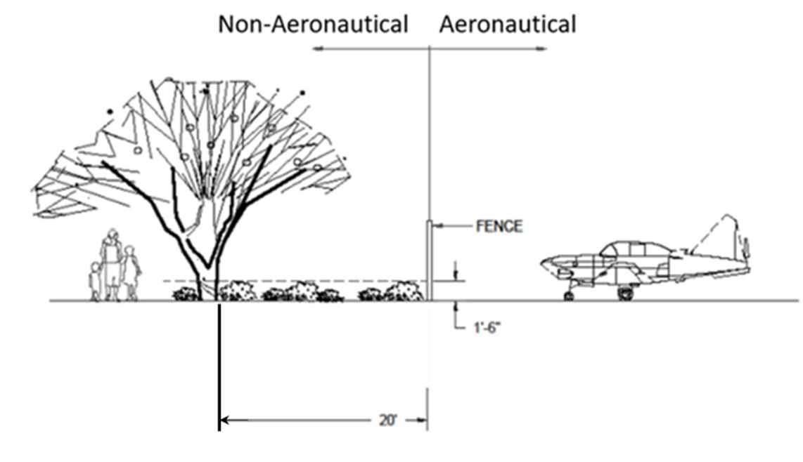 Air/Non-Aeronautical Buffer. Due to the need to provide visual surveillance from the non-aeronautical side to the aeronautical side, there shall be a 20-foot buffer on the non-aeronautical side for any proposed plantings. Trees planted outside the 20-foot boundary shall be forever trimmed to seven feet clear and in no case shall the mature canopy be greater than 20 feet in diameter. Within the 20-foot buffer, all plantings are limited to 18 inches in height. See Figure 2.7-C.