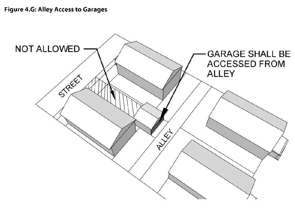 Vehicular access to streets, other than East Main Street, shall be from alleys. Alternative vehicular access to a street other than East Main Street may be granted at the discretion of the applicable decision-maker under this Code, based upon location and size of the access and how it minimizes pedestrian and vehicular conflicts with sidewalk and street traffic.