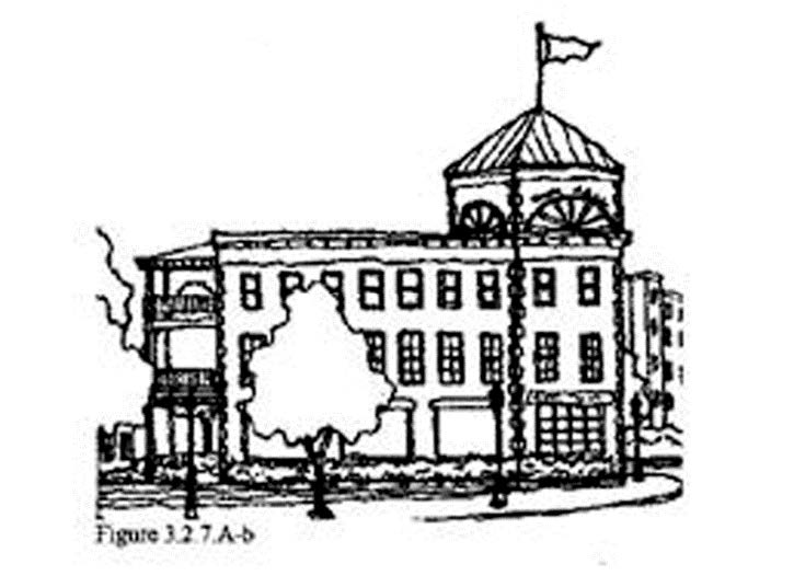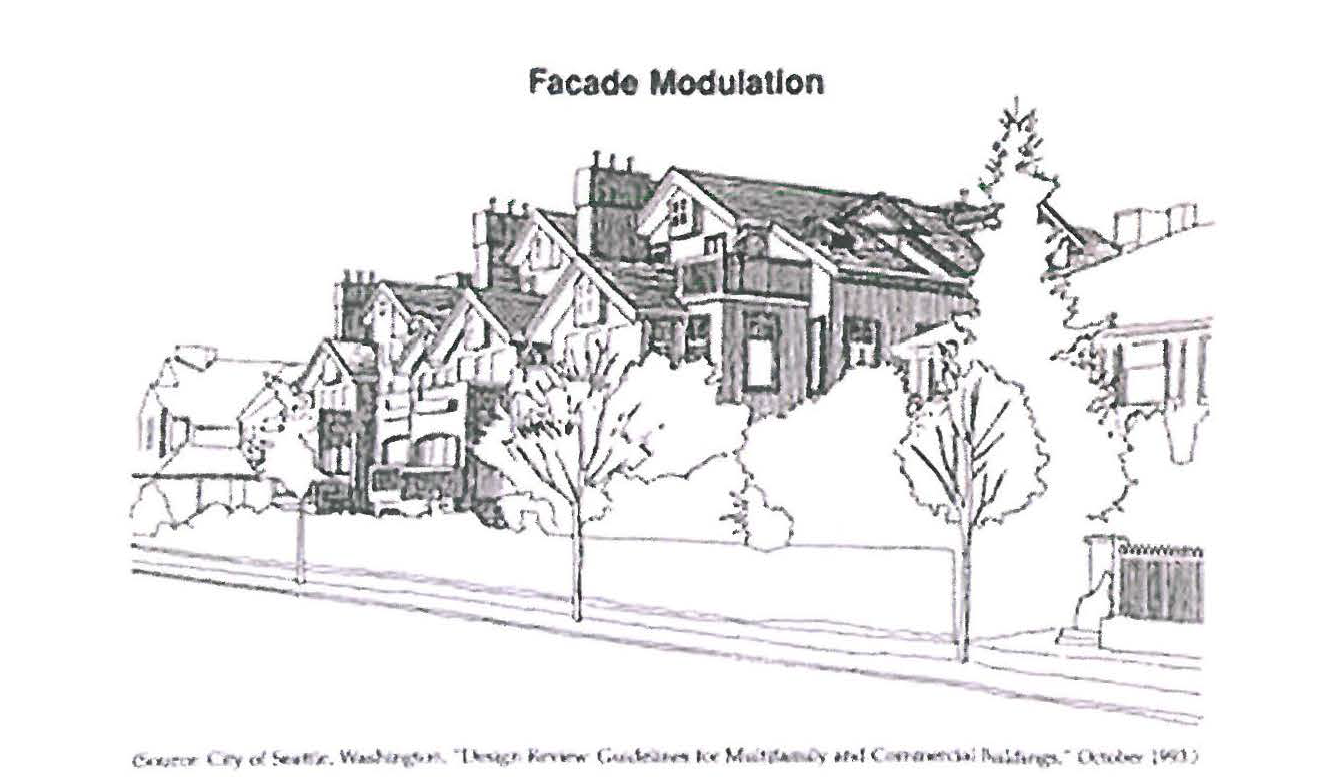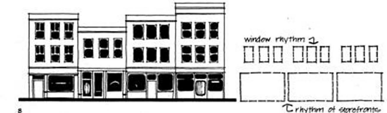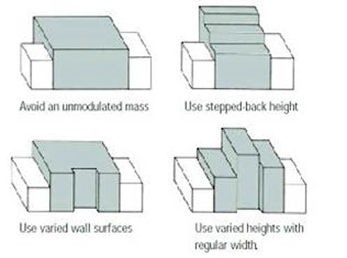 Building facades must be divided into increments or bays appropriate to the context of the street and neighborhood. These bays should never exceed 50 feet. Large structures should be subdivided along the street elevation with columns, pilasters, changes in materials, windows, doors, landscaping, setbacks, or other design techniques to modulate the wall plane. The building may extend as necessary along the street front (200 feet, for example), but visible articulation of the mass must occur at a minimum of 50-foot increments, or as dictated by the surrounding structures.