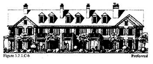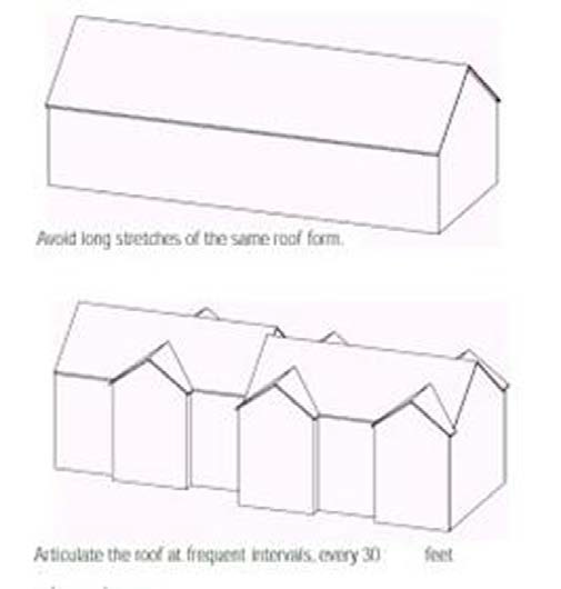 Rooflines shall be varied through the use of a combination of story heights, chimneys, cupolas, dormers, etc. Traditional roof forms shall be used to relate structures within the neighborhood.