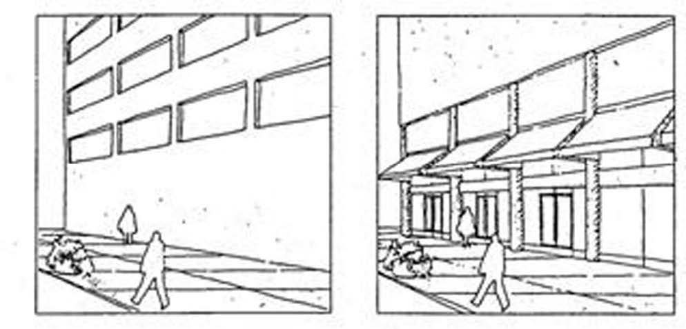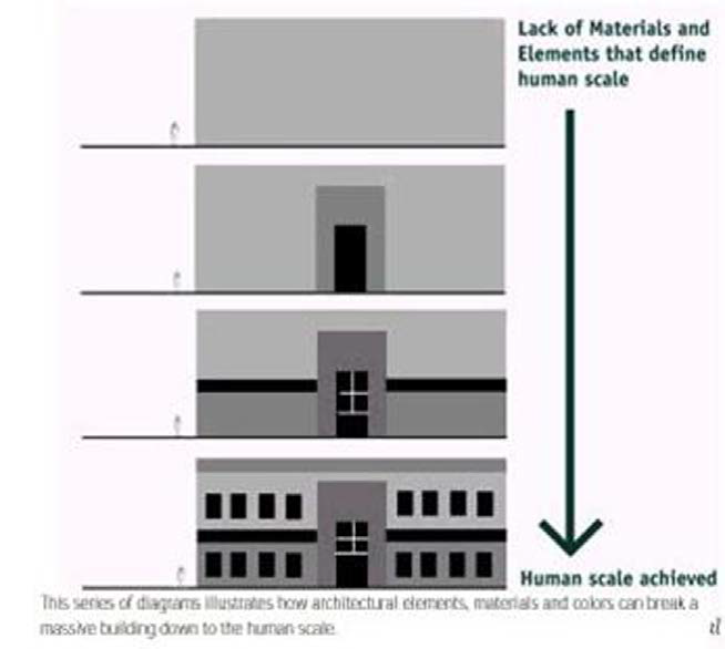Buildings shall achieve a human scale and pedestrian interest. This can be achieved by using elements like balconies, awnings, canopies, arcades, reveals, etc.