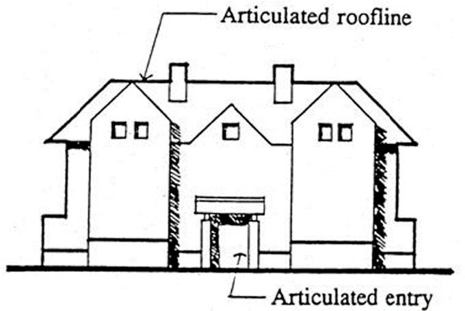 Building facades shall be articulated and varied. Primary signs of residential life such as front porches, bays, and balconies shall face the street. In no case will a building be permitted where the street façade is an unarticulated blank wall.
