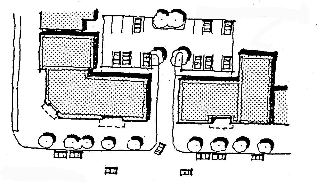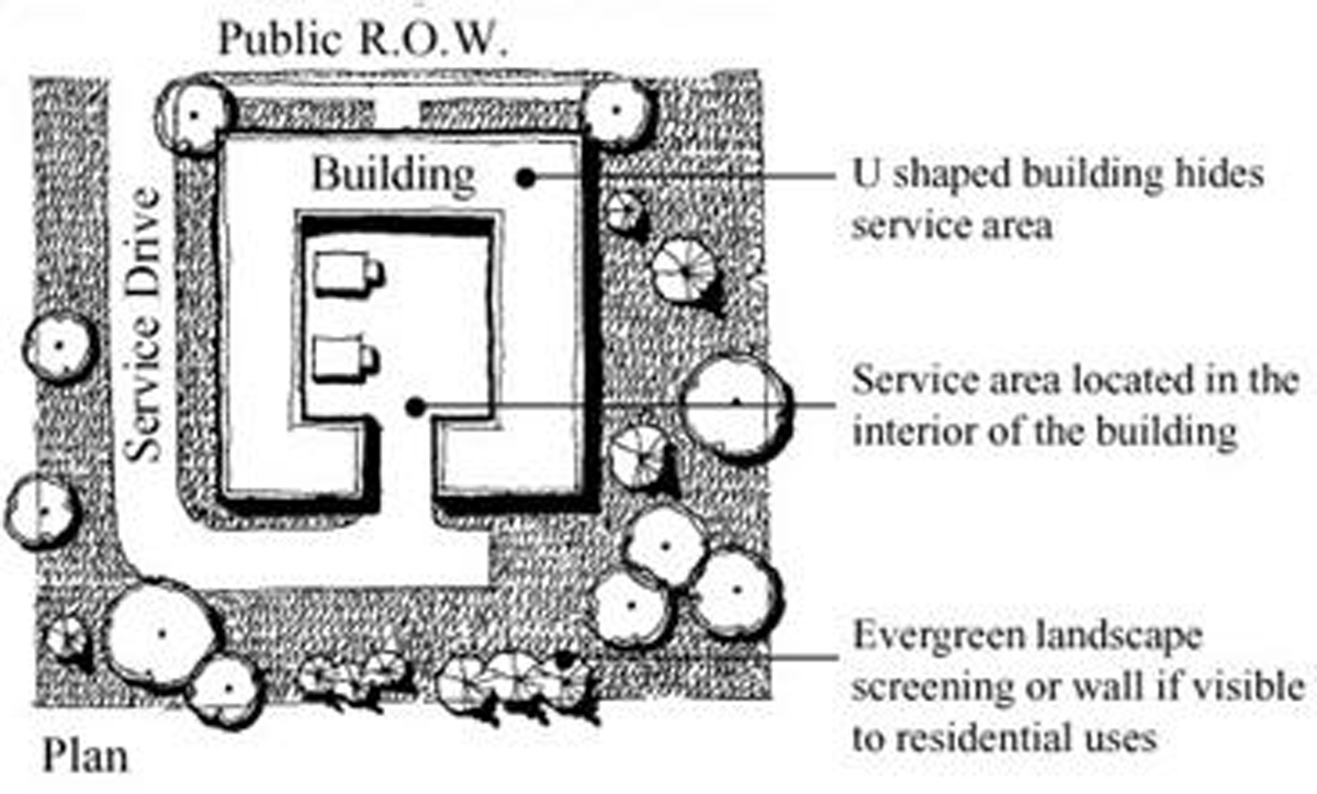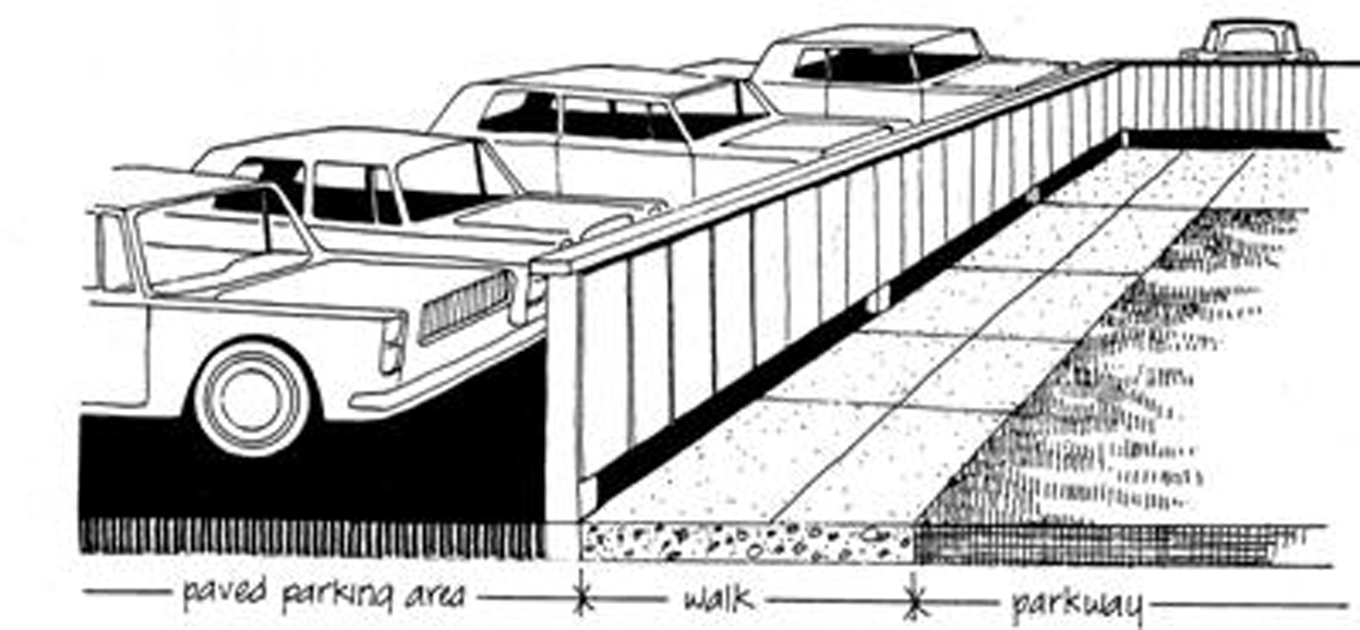 When a corner lot is used for parking, a three-foot garden wall that may incorporate seating may be used in place of hedges and screen planting.