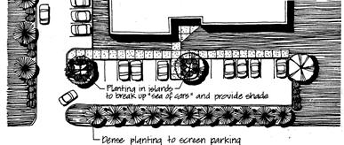 In areas where surface parking lots border the street edge, a vegetation border shall be established. This border may include grass, flowers, trees and hedges.