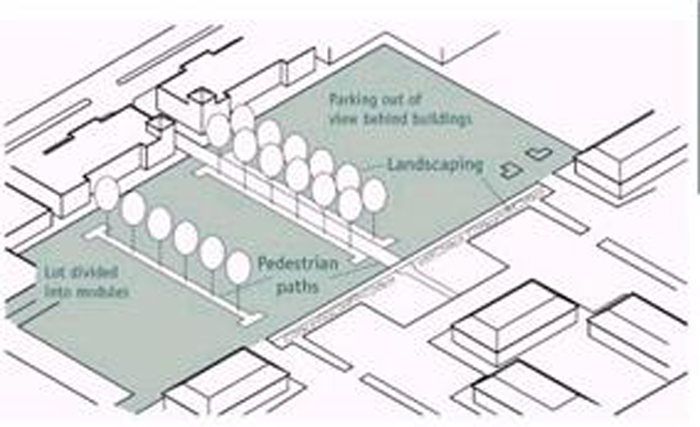The parking lot shall be designed to allow pedestrians to safely move from their vehicles to the building. In order to achieve this, a sidewalk shall be placed at the perimeter of the lot. In lots that have more than 20 spaces, pedestrian corridors shall be implemented within the parking area to channel pedestrians from the car to the perimeter of the lot. A paving material that is different from that of the vehicular area shall delineate these corridors.