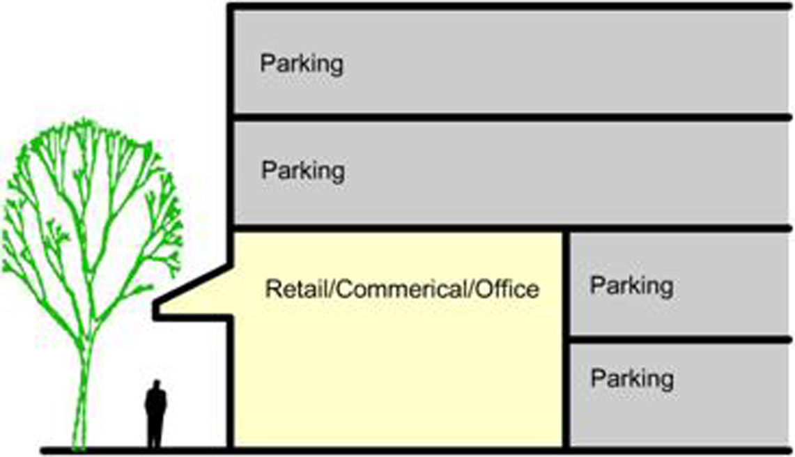 Parking structures shall be located behind some kind of wall or facade, so that the cars and parking do not dominate the public street. The wall may be buildings, housing, shops, and natural features. Parking structures are encouraged to incorporate other uses at the street level in order to protect the street frontage. If a parking structure does not contain other uses, then it shall demonstrate a careful and respectful street elevation design.