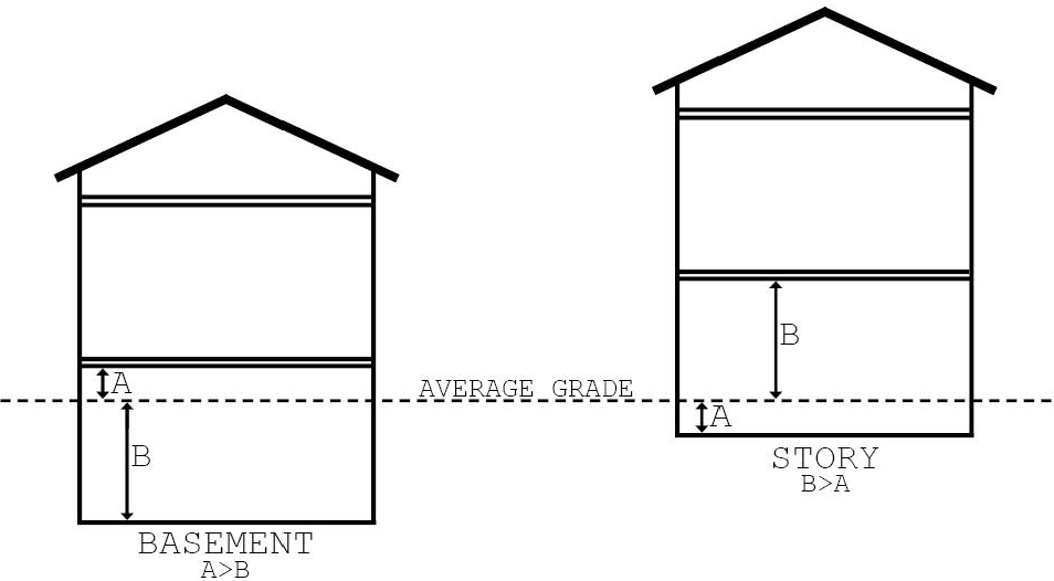 Basement means that portion of a building between floor and ceiling, which is partly below and partly above grade, but so located that the vertical distance from grade to the floor below is less than the vertical distance from grade to ceiling (see Story). See figure of a basement diagram below:
