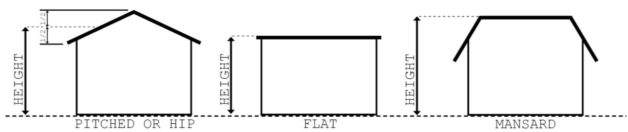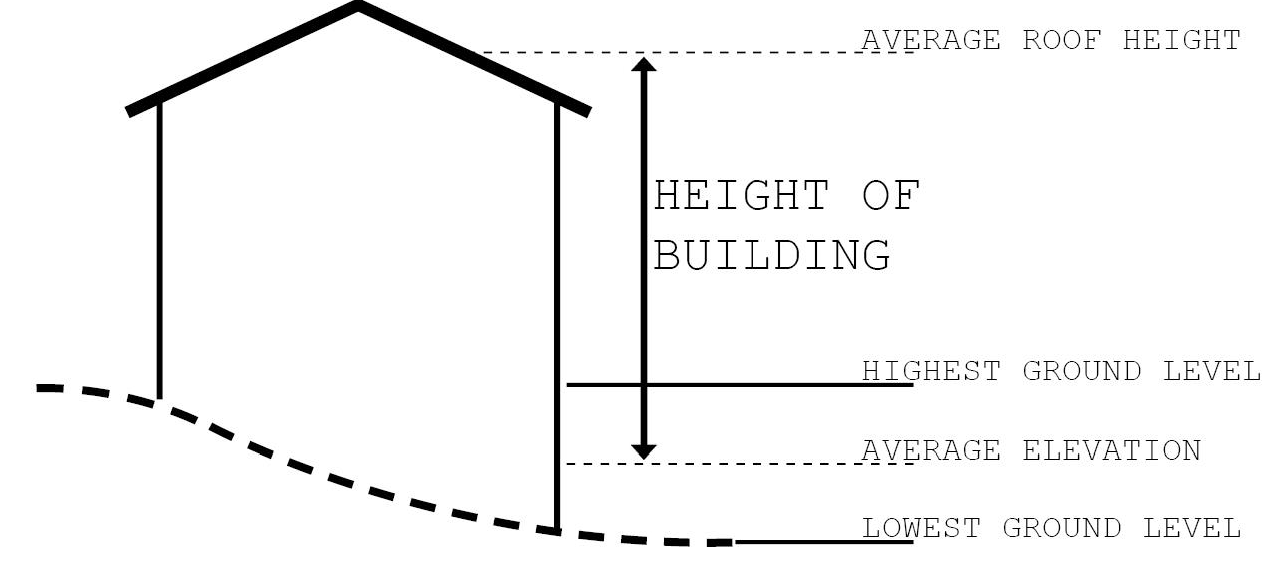 Building height means a distance to be measured from the mean ground level to the top of a flat roof, to the mean distance of the highest gable on a pitched or hip roof, to the deck line of a mansard roof, to the uppermost point on all other roof types. See figure of building height below: