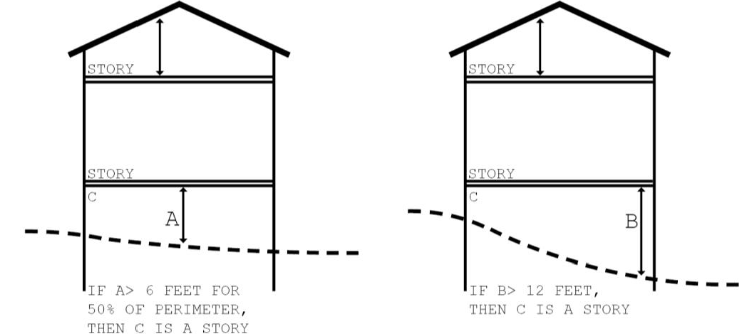 Story means the three-dimensional area of a building including space from the upper surface of a floor and upper surface of floor next above, except that the topmost story shall be that portion of a building, between the upper surface of the topmost floor and the ceiling above. If the finished floor level within a basement or cellar, or unused underfloor space is more than six feet above grade as defined herein for more than 50 percent of the total perimeter or is more than 12 feet above grade as defined herein at any point, such basement, cellar, or unused underfloor space shall be considered a story. See figure of a story below: