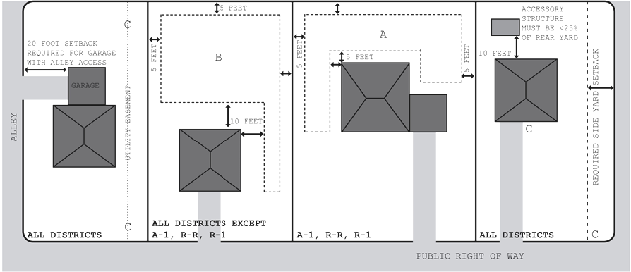 Accessory buildings may encroach into the required side and rear yard setbacks applicable to principal buildings, except, however, that no such encroachment may occur on required side yard setbacks abutting street in the case of a corner lot. For detached accessory buildings, the following standards shall apply: See Figure 13: