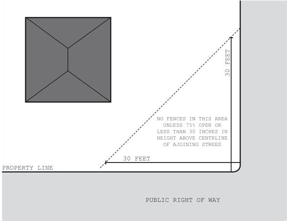 Corner lots. On corner lots, no fence or screen shall be permitted within the triangular area defined as beginning at the intersection of the property line or right of line of two intersecting streets, thence 30 feet from the point of beginning on the other property or right-of-way line, thence to the point of beginning, unless the fence or screening is at least 75 percent open or less than 30 inches in height above the centerline of the adjoining streets. See Figure 14 as follows: