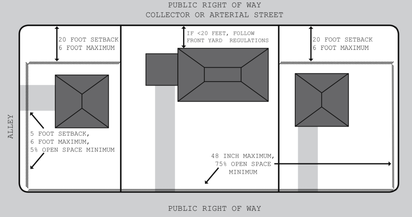 Fences extending across front yards shall not exceed 48 inches in height and shall be at least 75 percent open space for passage of air and light, except that fences which abut public rights-of-way which are designated and constructed as alleys shall not exceed six feet in height, shall be at least five percent open for passage of air and light, and shall be set back from the alley right-of-way a minimum of five feet. All such fences shall conform to subsection (8) of this section. See Figure 15.
