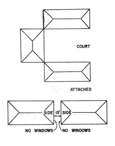A building forming the end of a court may be attached to one or both of the buildings forming the sides of the court, provided the distance between facing walls of the building forming the sides of the court is not less than the applicable requirements as set forth in this section. (See Figure 17.28-3)