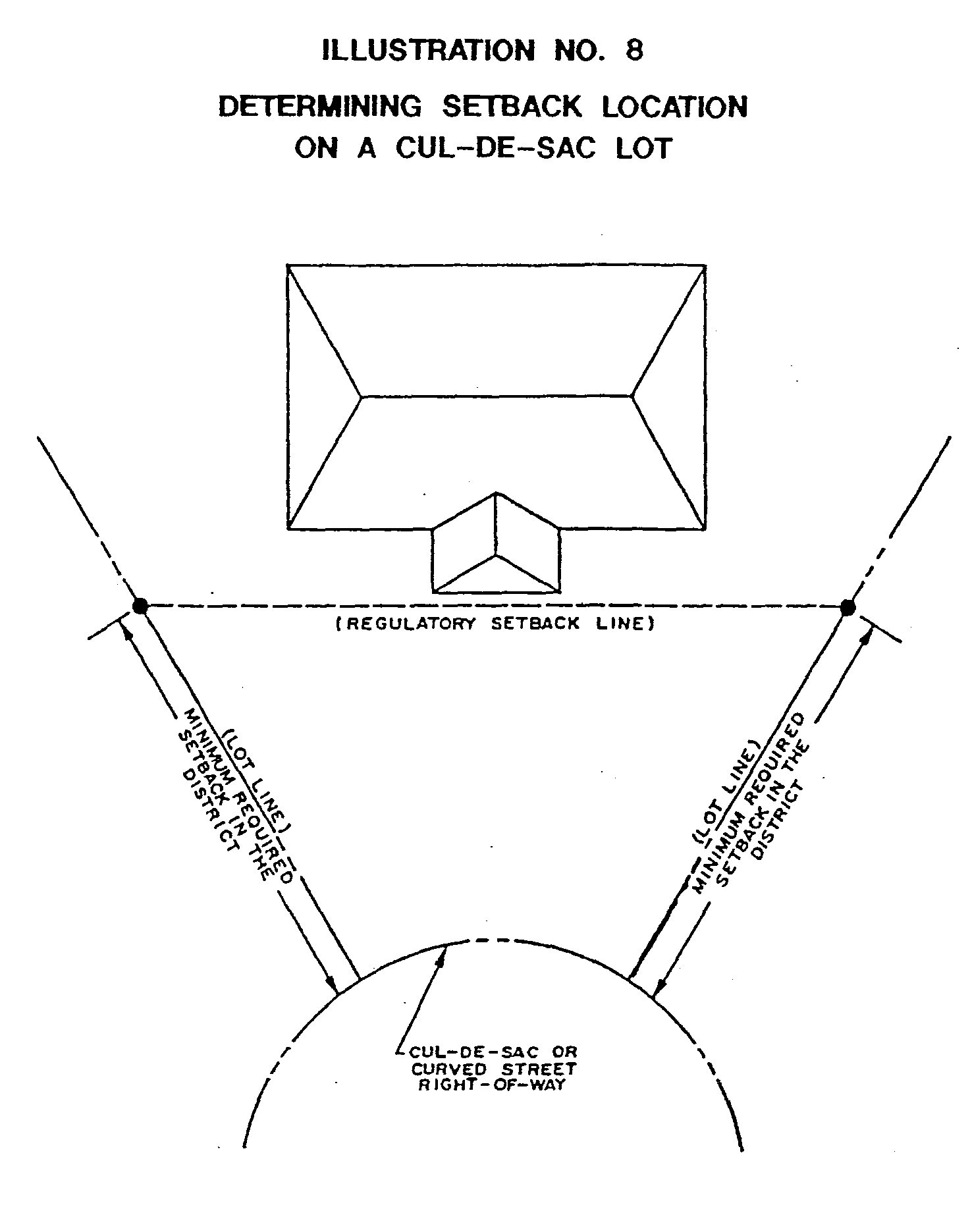 Measuring setbacks on cul-de-sacs. The required setback on cul-de-sacs and curved streets shall be determined by measuring the required setback alongside lot line and connecting those two points with a straight line. (See Illustration No. 8.)