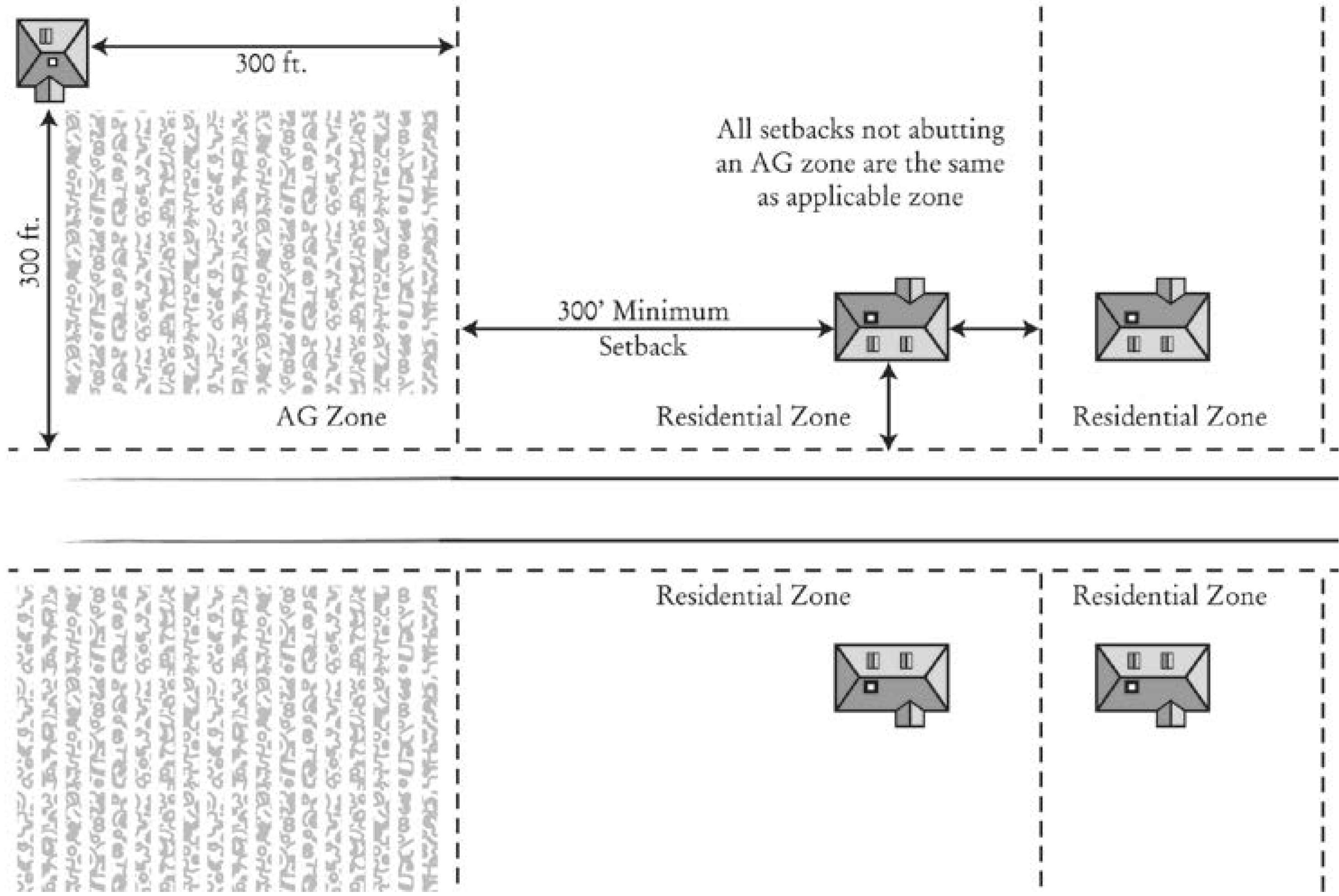 A setback is established for residential development from existing orchards and vineyards that are located in residential zones in order to reduce interference and conflict with preexisting agricultural operations, while providing for the development potential allowed by residential zones. The residential setback from orchards and vineyards is subject to the following requirements (Refer to Article III, Division 7, Agricultural Buffers, for agricultural buffer setbacks required where a developing residentially zoned parcel is adjacent to a parcel zoned Agriculture):