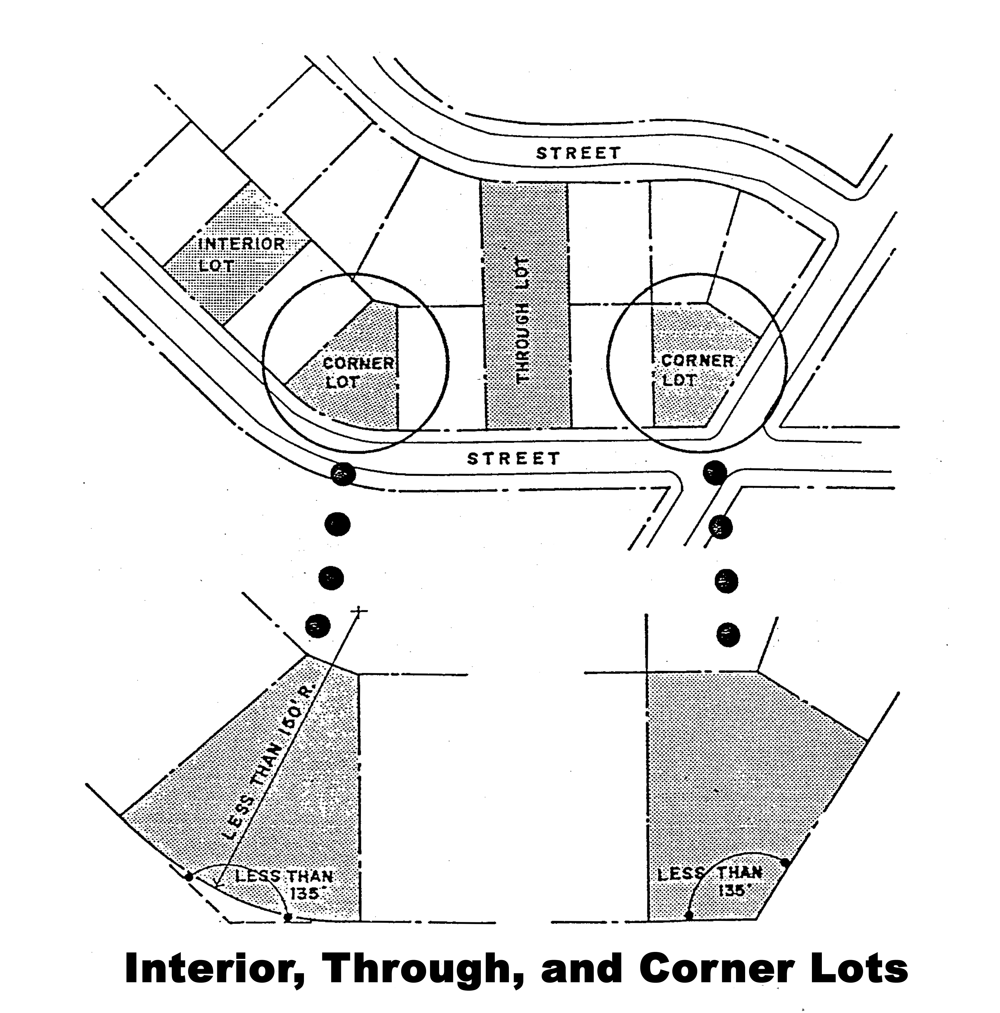 Lot, corner, means a lot where the interior angle of two adjacent sides at the intersection of two streets is less than 135 degrees. A lot abutting upon a curved street or streets shall be considered a corner lot for the purposes of this chapter if the arc is of less radius than 150 feet and the tangents to the curve, at the two points where the lot lines meet the curve or the straight street line extended, form an interior angle of less than 135 degrees.