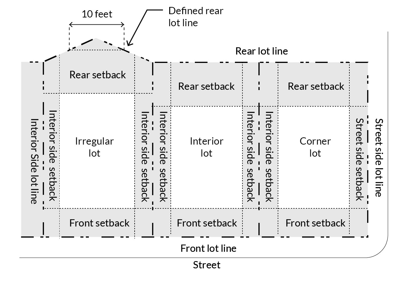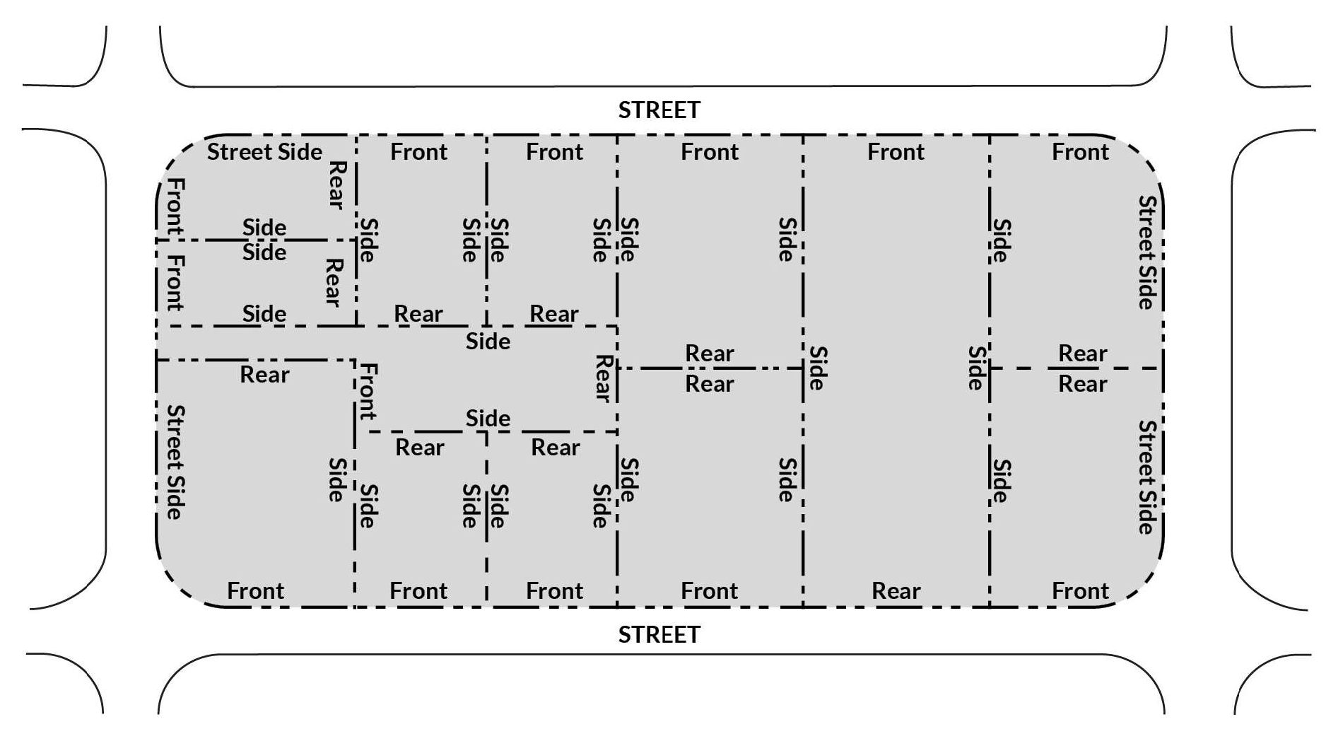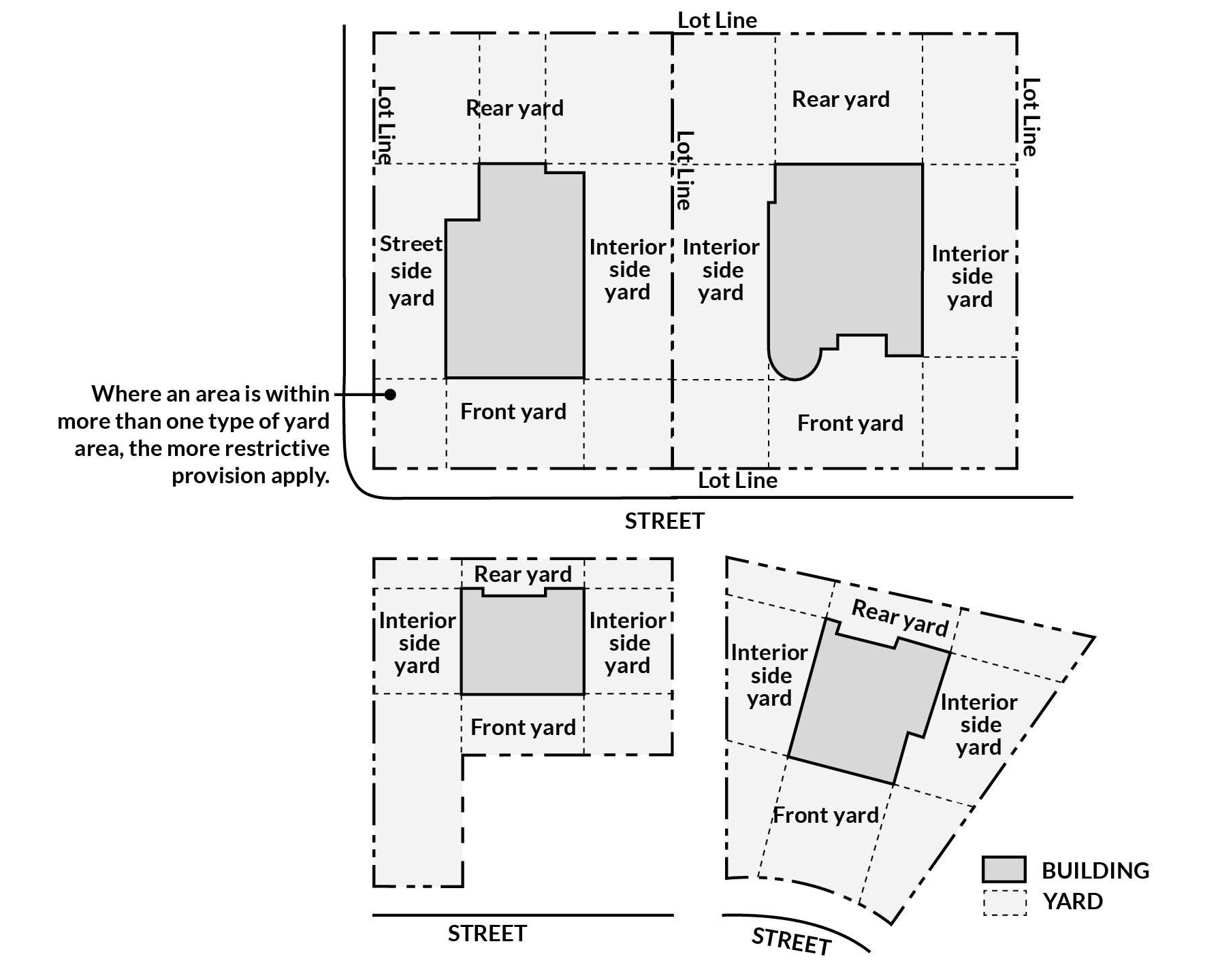 Side Yard. A yard extending from the rear line of the front yard to the front line of the rear yard.