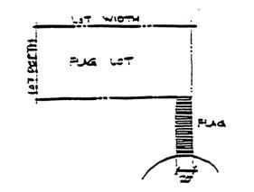Flag lots shall meet the minimum lot width requirement at the termination of the flag except for the RC, R-2 and RA zones (see example as follows):