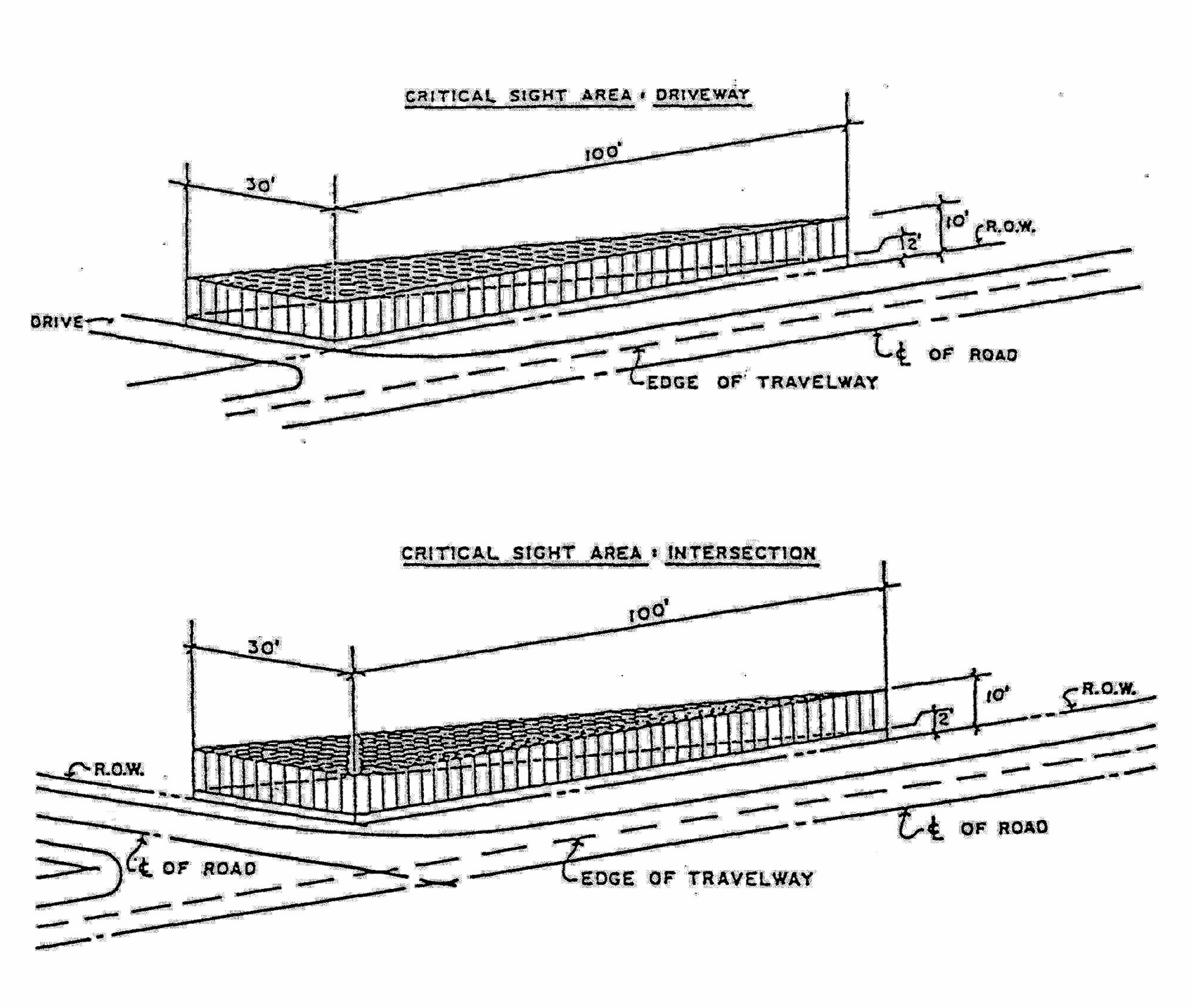 An unobstructed view of the intersecting street shall be maintained throughout the sight triangle within the "critical sight area," which is that area lying between two feet and ten (10) feet above the surface of the thirty (30) foot leg of the sight triangle.