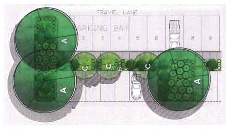 In this example, there are three medium-sized trees ("A") for eighteen parking spaces, with ground cover ("B") and shrubs ("C").