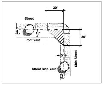 Street side yard: No closer than five feet from the street property line and not within the triangular area formed by measuring thirty feet along the front and street side property lines along the right-of-way from their "extended" intersection and connecting these two points.