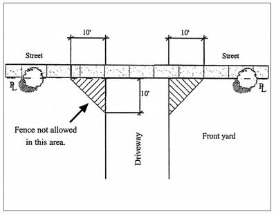 Driveways. No fence wall, lattice or screen over three and a half feet shall be allowed within the triangular area formed by measuring ten feet along the street property line and ten feet along the driveway from their "extended" intersection and connecting these two points.