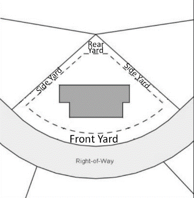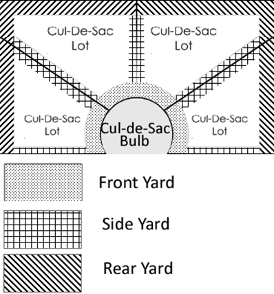 "Lot types" means "corner lot," "interior lot," flag lot," "double frontage lot," "reversed corner lot," and "key lot" as depicted in Figure 1-1 (Lot Types and Yards), below. Also includes a "cul-de-sac lot" that is located along the curved terminus formed by the bulb of a cul-de-sac street, as depicted by Figure 1-2 (Cul-de-Sac Lots) and a "pie-shaped lot" where the side lot lines are approximately radial to the curve of the street upon which it fronts, as depicted in Figure 1-3 (Pie-Shaped Lot). Any other lot type not defined herein shall be considered an "irregular lot."
