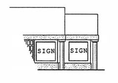 The signs may be attached to or painted on the building or freestanding. If attached, the signs shall be parallel to the building wall to which it is attached and shall not project above the roof-line nor extend beyond one foot of the wall. If freestanding, the signs shall not project over public property and shall not be more than six feet high. The support structures for all freestanding signs shall be surfaced in a manner to appear to be of the same materials, color and texture as the buildings located on the site.