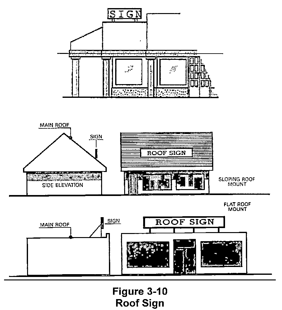 "Roof sign" or "roof-mounted" sign means a sign that is mounted upon a roof or above a parapet or eave of a building or structure or above the highest point of the ridgeline.
