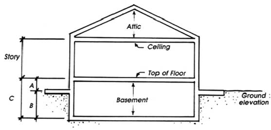 When the vertical distance ("A") is less than or equal to two feet from grade to the finished floor directly above, then the space described by "A" and "B" combined is considered a basement.