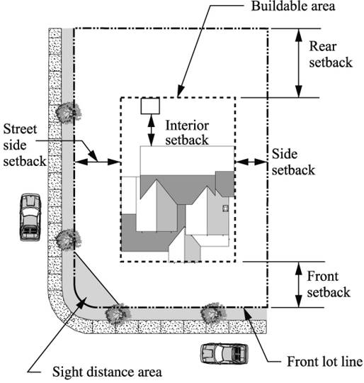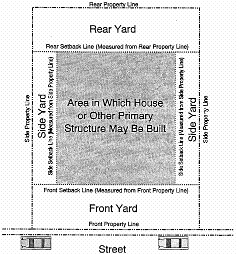 "Setback" means the distance by which a structure, parking area, or other development feature must be separated from a lot line. Setbacks from private streets are measured from the edge of the easement. See also "Yard." Figure 6-8 (Setbacks) shows the location of front, side, street side, rear, and interior setbacks.