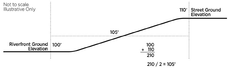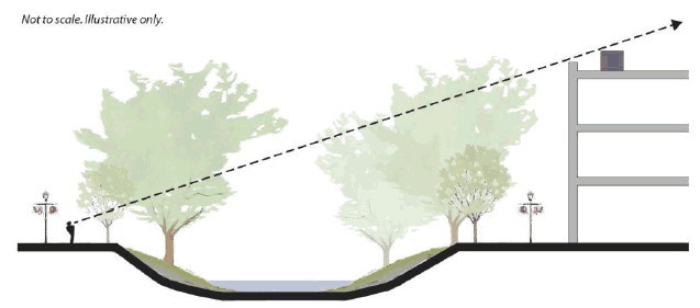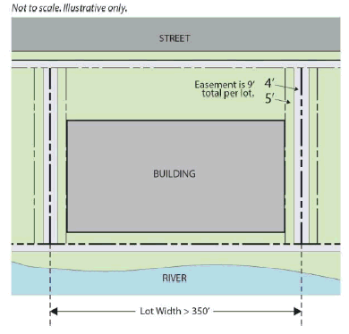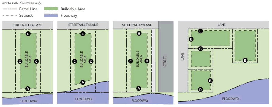 As illustrated in Figure 4.22, fences with a maximum height of seventy-two (72) inches shall be permitted in a front setback along a street or a lane if the opposite side of the property is abutting the floodway with no vehicular access, and vehicular access is from the street or lane.